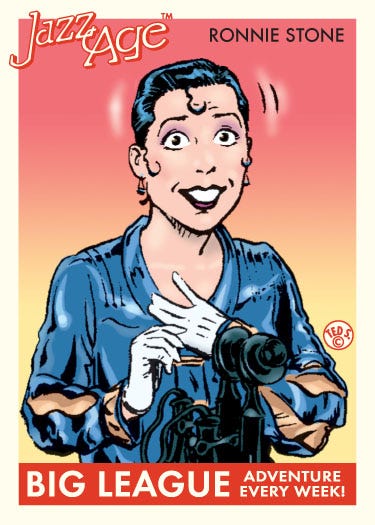 The stories I’m running here are from the early 2000s webcomic that was a follow-up to the black-and-white comic book Jazz Age Chronicles published in the early ‘90s by Caliber Press (and available in graphic novel form here). You can just start reading from scratch — and I think you’ll figure things out pretty quickly — but if you want a heads-up on who’s who, check out the Cast of Characters below.